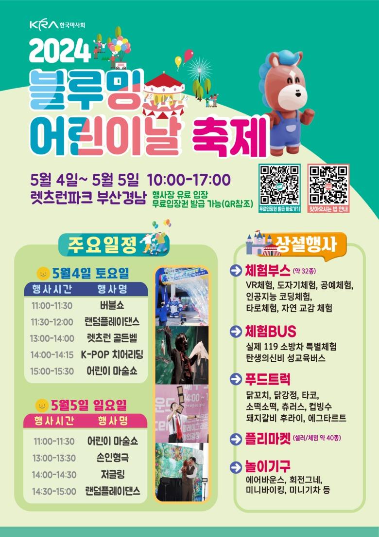 마사회 대표 캐릭터인 ‘말마(MALMA)’와 함께하는 ‘말마 패밀리 데이’, ‘블루밍 어린이날 축제’, ‘몽생이 가족소풍’ 등 지역별 이색테마와 다채로운 콘텐츠로 어린이 친구들을 맞이할 예정이다.