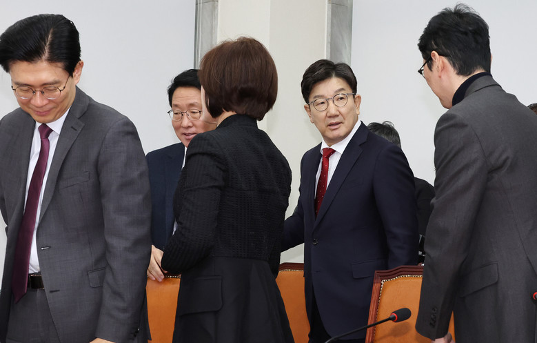 국민의힘 권성동 대표 권한대행 겸 원내대표(오른쪽 두번째)가 23일 오전 국회에서 열린 원내대책회의에 입장해 참석한 의원들과 인사하고 있다. 2024.12.23