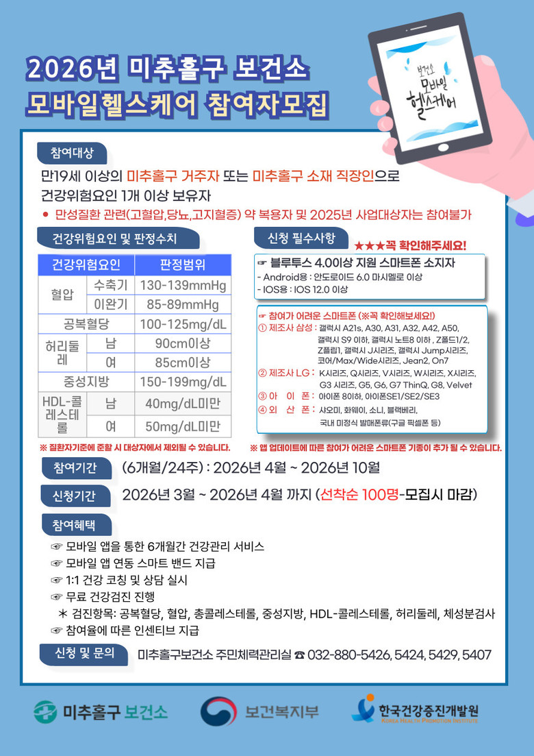 한편, 보건소는 모바일 헬스케어 사업을 통해 비대면 건강관리 환경을 조성하고, 주민의 지속적인 건강생활 실천을 유도하는 등 예방 중심 공공보건 서비스 체계를 강화해 나갈 계획이다. 모바일 헬스케어 사업 참여 및 자세한 사항은 미추홀구보건소 주민체력관리실(☎ 880-5424, 5429)로 문의하면 된다.