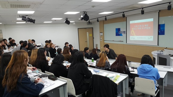 | ▲ 유한대학교 재학생들이 경기광역치매센터 김영숙 국장으로부터 ‘치매 이해 및 예방 그리고 치매 국가책임제’라는 강연을 듣고 있다.© 세계타임즈 |