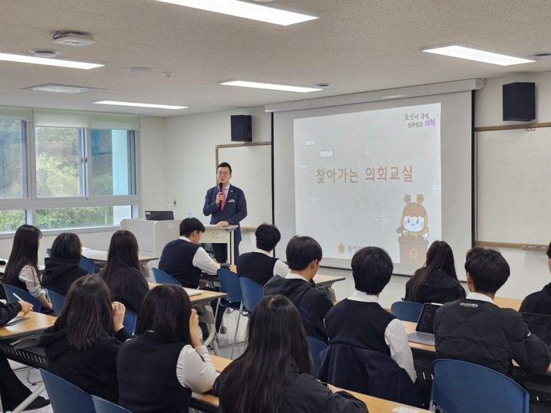 이날 의회교실에는 건설환경소방위원회 소속 이태훈 의원(괴산)이 괴산고등학교 학생 50여 명을 대상으로 조례 제·개정, 예산·결산 심의, 행정사무감사 등 도의회의 역할을 설명했다.