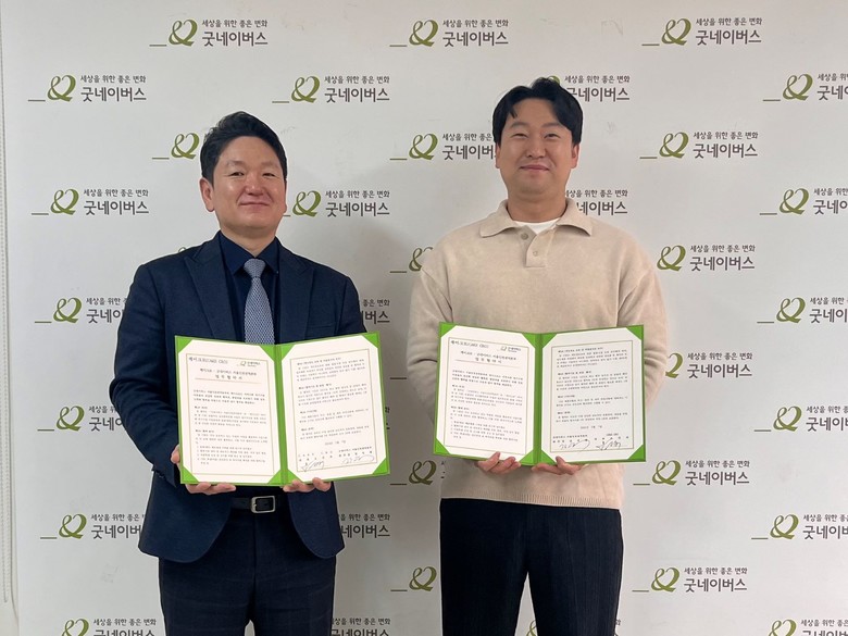 | ▲7일(목), 사진은 협약문 기념촬영 진행하는 모습. 왼쪽부터 장성계 굿네이버스 서울인천권역본부장, 오진욱 케이크로 대표 |