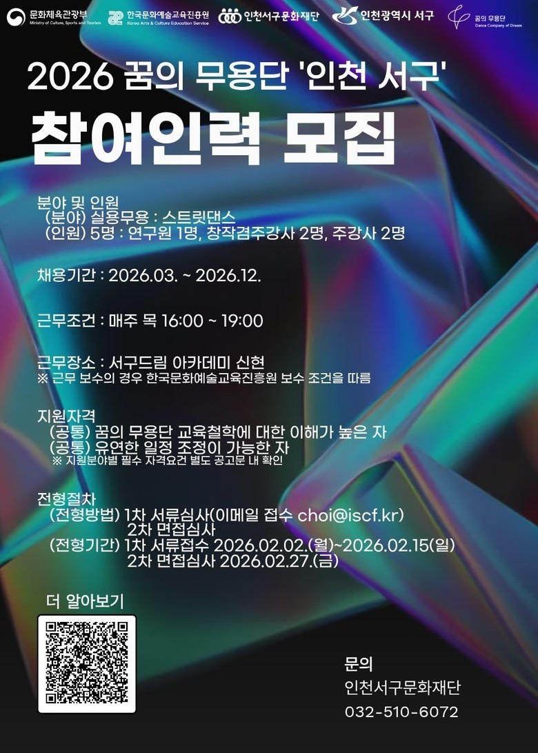 한편, ‘꿈의 무용단 인천 서구’ 참여인력 채용 서류 접수는 2026년 2월 2일(월)부터 2월 15일(일) 자정까지 진행된다. 접수는 이메일을 통해 가능하며, 세부내용과 지원 서식은 인천서구문화재단 홈페이지(www.iscf.kr)에서 확인할 수 있다. 채용 관련 문의는 인천서구문화재단 문화예술교육지원센터(032-510-6072)로 하면 된다.