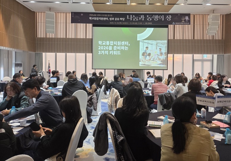 [경남 세계타임즈=최성룡 기자] 경상남도교육청(교육감 박종훈)은 4~5일 이틀간 ‘학교통합지원센터, 나눔과 동행의 장’을 주제로 2025년 학교통합지원센터 운영 성과를 공유하고 2026년의 새로운 발전 방향을 모색하는 성과 공유마당을 한화리조트 거제 벨버디어에서 개최했다.