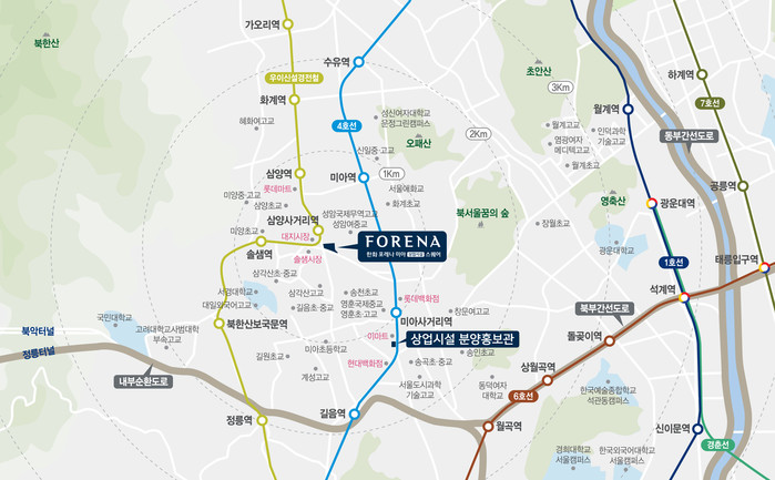 단지 주변으로 대규모 개발도 계획되어 있어 미래가치도 높다. 삼양사거리 부근은 지구단위 계획에 따라 특별계획구역으로 지정됐으며, 한화 포레나 미아는 삼양사거리 개발 계획 중 첫번째로 들어서는 단지다. 이밖에도 미아2구역, 미아3구역 등 다수의 정비사업이 인근에서 추진 중이어서 주거·생활 인프라가 꾸준히 개선될 전망이다.