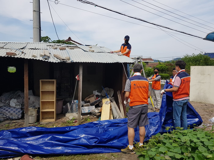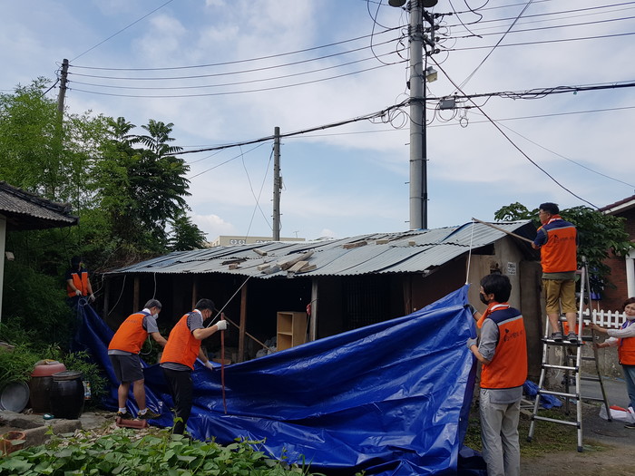 이날 봉사에는 천정훈 단장을 비롯해서 자원봉사 10명이 덕암동 행정복지센터 홍영옥 덕암동장, 직원들과 함께 여름철 장마 및 태풍을 대비해서 노후된 창고 지붕을 천막으로 덮는 봉사를 하였다.