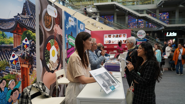 세계인의 이목이 몰리는 ‘파리올림픽’을 한 달 앞둔 파리, 중심가 1구의 대형쇼핑몰 ‘포럼 데 알의 마당’은 ‘한국으로의 여행’을 체험하는 공간으로 변신했다. 안내대를 거쳐 대한항공 1등석 좌석이 설치된 한국 여행 사진 촬영구역(포토존)은 젊은 한류팬과 가족들로 북적였다. 케이팝 커버댄스 공연과 맞춤 색상(퍼스널 컬러) 진단, 메이크업 시연, 방한 여행 토크쇼에도 많은 사람이 모인 가운데 한글 이름 써주기, 떡볶이 등 길거리 음식 체험, 전통주 칵테일 시음 등이 큰 인기를 끌었다. 현지 10~30대 한류 관심층을 대상으로 ‘한국 고등학교’에 입학한 콘셉트의 홍보 구역에는 한복 필터 사진 촬영, 한국관광 광고 퀴즈 등 미션을 수행하고 기념품을 받기 위한 긴 줄이 이어졌다. 참가자들은 어학연수·유학 등 교육 여행과 한국문화 체험, 스포츠 관광상품 안내 등 프랑스 현지의 관심사에 맞춘 관광상품 안내에 높은 관심을 나타냈다.