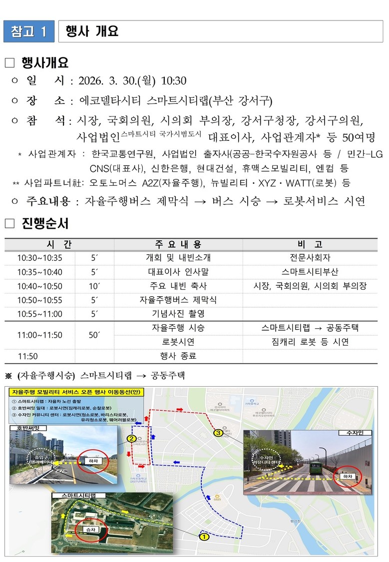 ◈ 시, 공공과 민간이 협력하는 도시개발 모델을 통해 시민이 체감할 수 있는 안전하고 편리한 스마트도시 구현에 박차… ▲자율주행 모빌리티·로봇 서비스 단계적 확대 ▲데이터 기반 도시 운영체계 고도화를 통해 미래 스마 [부산 세계타임즈=이용우 기자] 부산시(시장 박형준)는 에코델타 스마트시티 국가시범도시의 본격 추진을 알리는 자율주행 모빌리티 서비스 오픈식이 내일(30일) 오전 10시 30분 에코델타시티 스마트시티랩에서 열린다고 밝혔다.