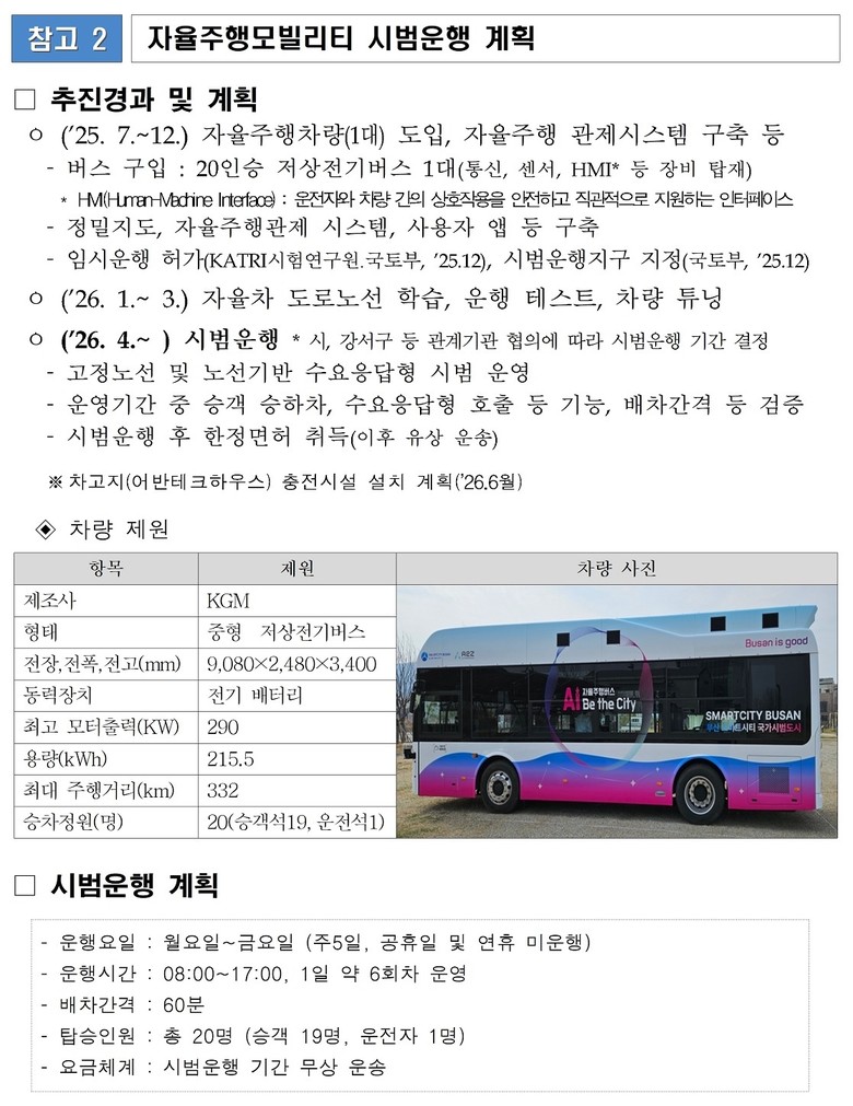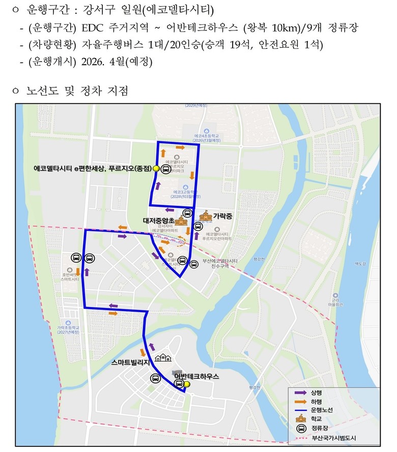 국가시범도시 사업법인 스마트시티부산㈜(대표 이계형)는 이번 서비스 개시를 계기로 자율주행과 로봇 기반 도시서비스 실증을 본격화하고, 데이터 기반 운영을 통해 스마트시티 모델 확산 기반을 마련할 계획이다.