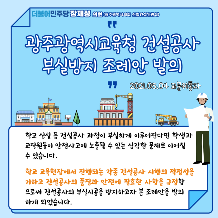 장재성 의원은 “학교 교육현장에서 진행되는 각종 건설공사 시행의 적정성을 기하고 건설공사의 품질과 안전에 필요한 사항을 규정함으로써 건설공사의 부실시공을 방지하여 안전한 교육환경을 구축하기 위해 본 조례안을 발의하게 됐다”고 취지를 밝혔다.