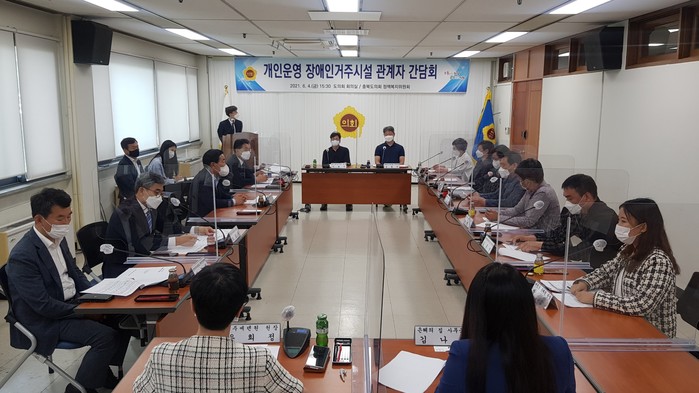 [충북=세계타임즈 이현진 기자] 충북도의회 정책복지위원회(위원장 박형용)는 4일 도의회 회의실에서 전국장애인법정시설협회 충북지회와 ‘개인운영 장애인거주시설 지원 방안 모색’을 위한 정책간담회를 가졌다.