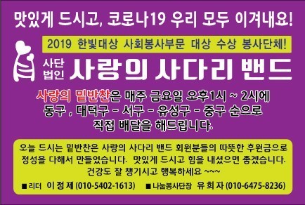 대전뇌병변장애인인권협회 유선경 회장은 “매월 둘째주 금요일에 맛있는 밑반찬을 지원해주는 사랑의 사다리 밴드 봉사단체에 감사함을 전한다.”고 말했다.