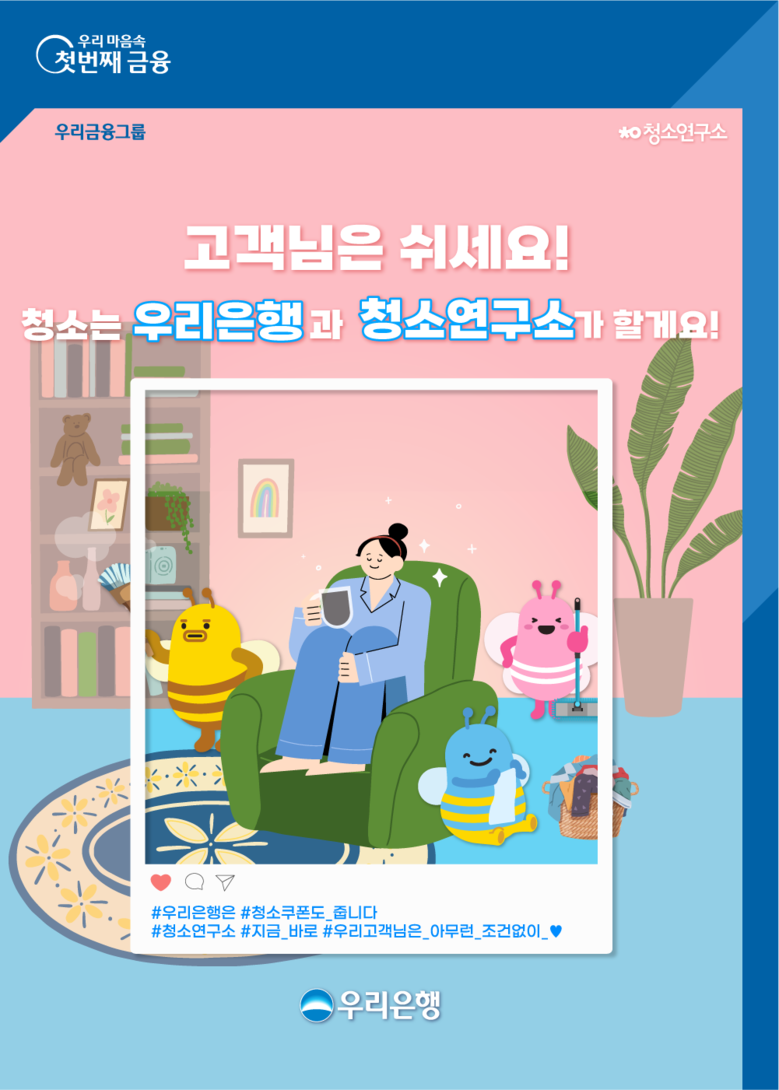 우리은행 관계자는 “따뜻한 봄을 맞아 고객들의 청소, 세탁 등 가사 대행 서비스에 대한 관심이 높아지고 있어 이번 이벤트를 기획했다”며 “앞으로도 우리 고객님들의 편의를 위한 다양한 이벤트를 선보일 것”이라고 밝혔다.