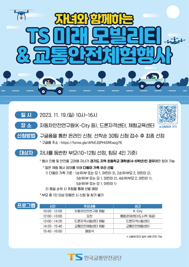 참가 신청은 체험행사 포스터(QR코드) 또는 한국교통안전공단 누리집(www.kotsa.or.kr)을 통해 할 수 있다.
