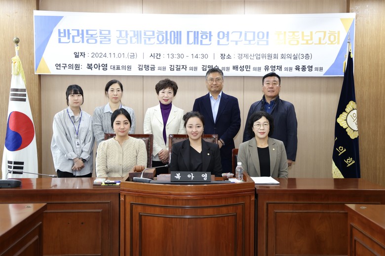 연구모임은 복아영 의원을 대표로 김행금 의장과 김길자·김명숙·배성민·유영채·육종영 의원이 참여하였으며, 2024년 3월 1차 간담회를 시작으로 7개월 동안 간담회 . 정책 연구용역 발주 . 다른 지역의 공공 장례 시설 견학과 더불어 반려동물 교육 현장과 민간 장례식장 현장 방문 등 다양한 활동을 통해 정책 방향을 모색해 왔다.