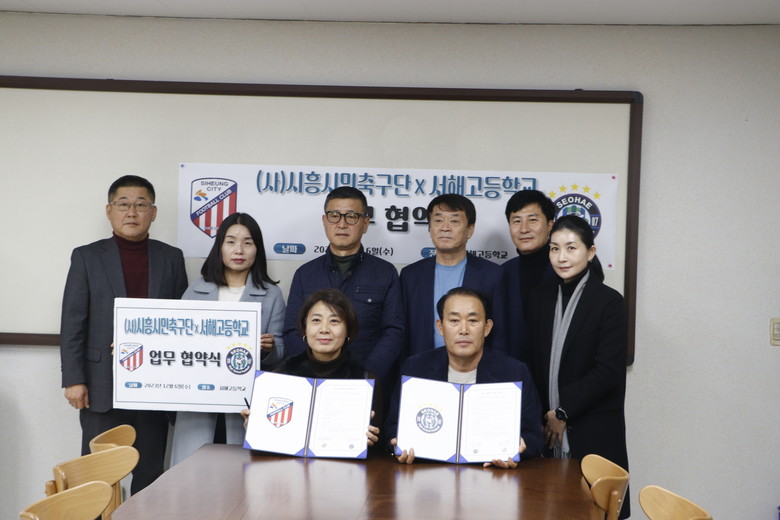 [시흥시 세계타임즈=송민수 기자] 서해고등학교(교장 이재선)는 12월 6일 서해고등학교에서 시흥시민축구단, 서해고 축구부 서포터즈(지역사회)와 함께 “상호 간의 교류 협력을 위한 업무협약”을 체결하였다.