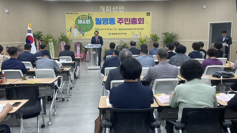 [세계타임즈]최성룡기자 = 창원특례시 마산합포구 월영동 주민자치회(회장 김종식)는 2024년 8월 22일 17시 마산합포구 구청장(강창열)과 월영동장(오성석), 경상남도의회 정쌍학 의원, (건설소 방위원회, 예산특별위원장), 창원시의회 박선애 의원(기획행정위원회 위원장), 전홍표 의원(건설해양농림위원장), 정길상 의원(문화환경도시위원회) 및 내빈과 주민 100여명을 모시고 월영동행정복지센터 2층 대강당에서 2024년 제4회 월영동 주민총회를 성황리에 마무리했다.