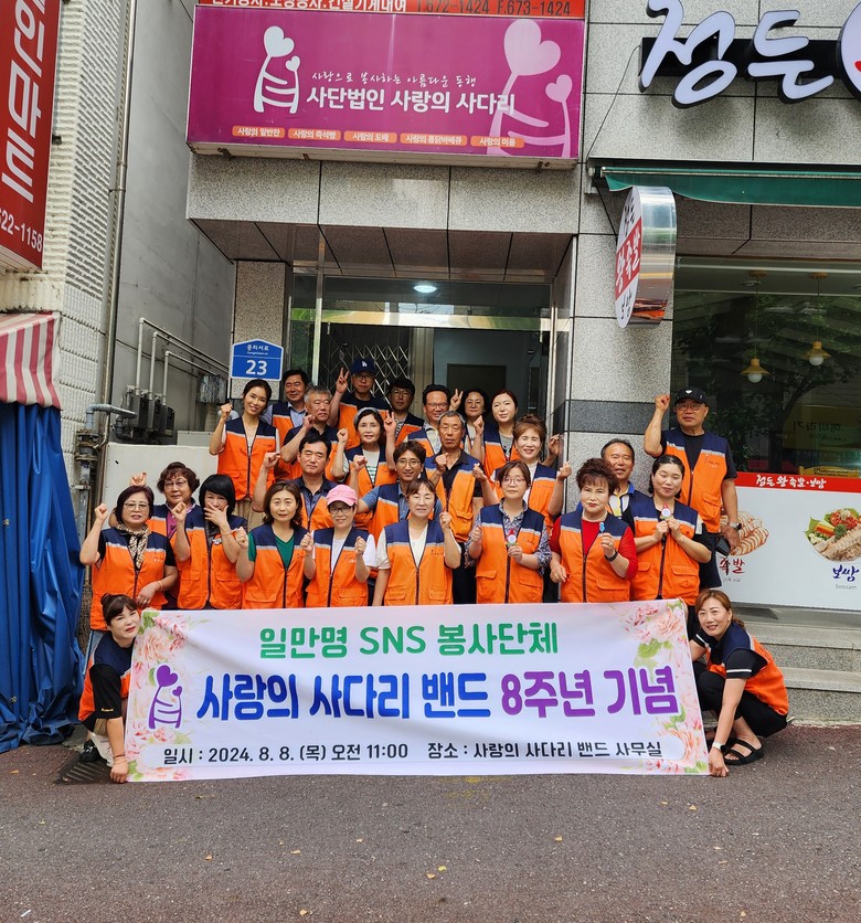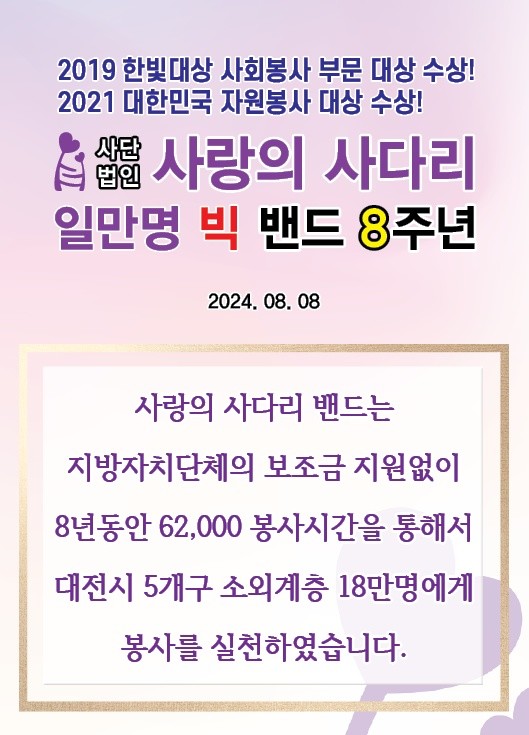 이정제 리더는 "지방자치단체의 보조금 지원 없이 회원들의 자발적인 후원금과 적극적인 봉사 참여로 오늘 8주년을 맞이하였다"며 "오늘 8주년을 기점으로 어려운 길을 함께 걸어오신 1만 명 회원분들게 감사 드리고 대전시 5개구 소외 계층을 위해 더 열심히 봉사하겠다"고 밝혔다.SNS 봉사단체 사단법인 사랑의 사다리 밴드는 현재 1만 명이 회원으로 가입돼 있고,