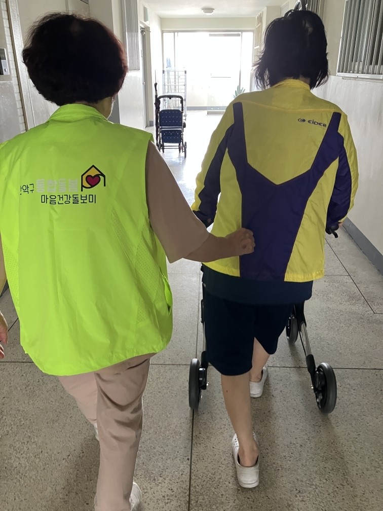 | ▲ 관악구 퇴원환자 전담케어 매니저가 대상자의 보행 연습을 돕고 있는 모습 |