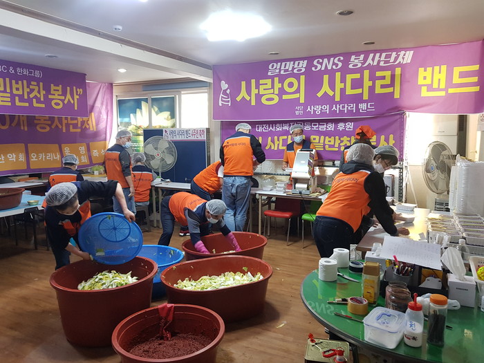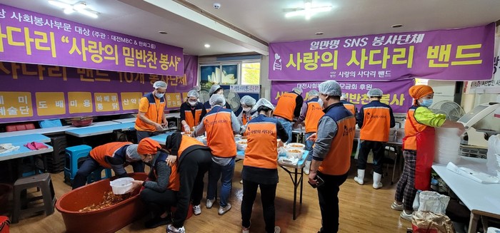 [대전=세계타임즈 이채봉 기자] 대전광역시 SNS 일만명 봉사단체 사랑의 사다리 밴드(리더 이정제)는 12일 오전9시~오후1시에 대덕구 중리동에 위치한 사랑의 사다리 밴드 사무실에서 밑반찬을 만들어서 서구 소외계층 54가정에 전달하였다.