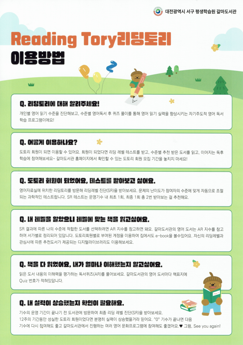 기타 자세한 사항은 갈마도서관(☎042-288-4753) 및 가수원도서관(☎042-288-4778)으로 문의하면 된다.