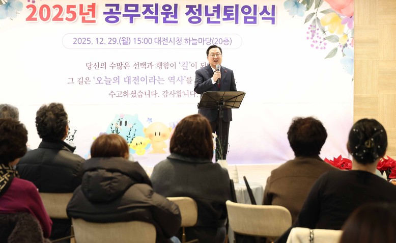 [대전 세계타임즈=이채봉 기자] 대전시는 29일 시청 하늘마당(20층)에서 정년퇴직 공무직원, 가족, 동료 직원 등 50여 명이 참석한 가운데 ‘2025년 공무직원 정년퇴임식’을 개최했다.