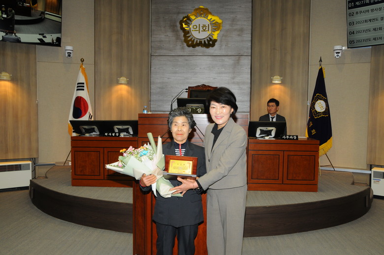 이날 본회의 개회에 앞서 순창읍 충신1마을 고영숙 부녀회장이 군민이 공감하는 신뢰받는 의회 발전의 공을 인정 받아 순창군의회의장이 수여한「2023년 의정발전 유공 민간인 표창패」를 전달받았다.