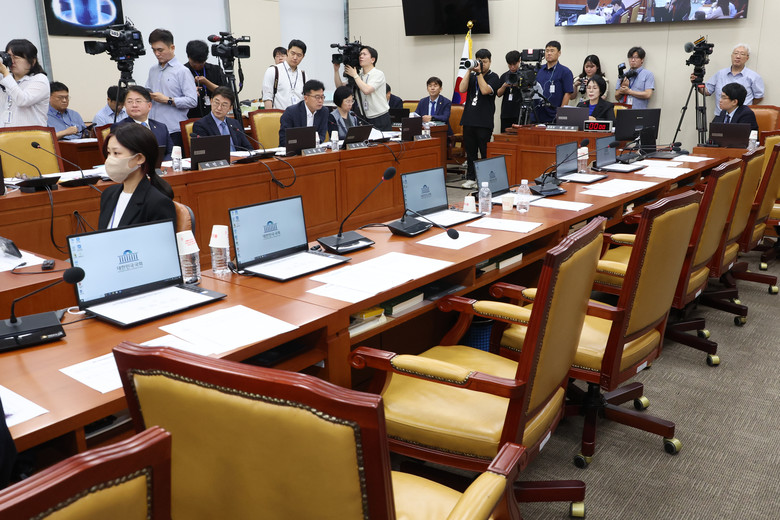 이날 청문회는 핵심 증인인 이진숙 방송통신위원장과 김태규 방송통신위원장 직무대행(부위원장)이 불출석하고, 국민의힘 의원들이 퇴장한 가운데 열렸다. 2024.8.21