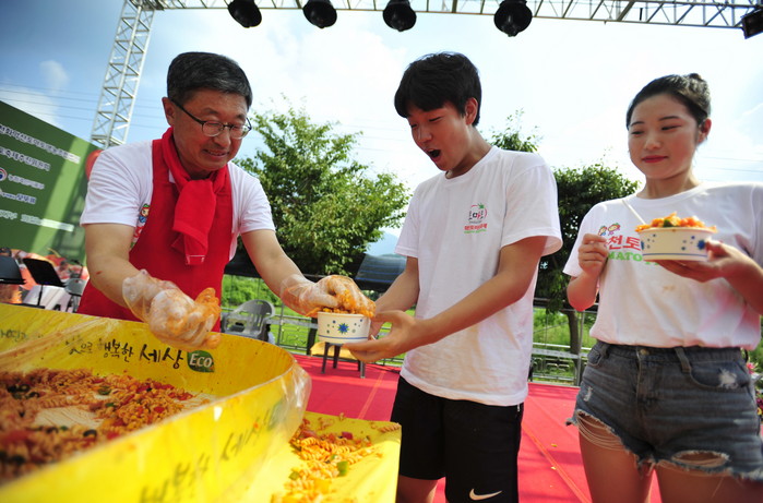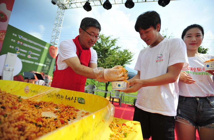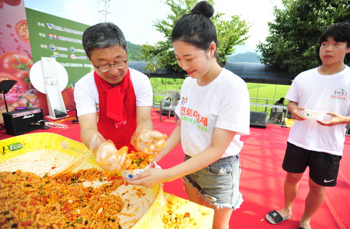 2018 화천토마토축제 이틀째인 3일 사내면 문화마을에서 열린 '천인의 식탁' 이벤트에서 지순식 화천부군수가 관광객들에게 파스타를 나눠주고 있다. 이번 행사는 (주)오뚜기 후원으로 진행됐다.