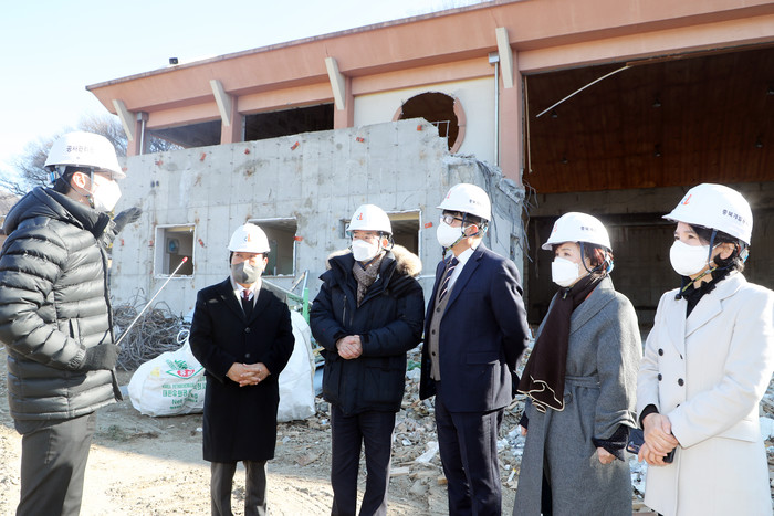 [충북=세계타임즈 이현진 기자] 충북도의회(의장 박문희)는 28일 충청북도의회 현안사업인 도의회 청사건립 관련 구)중앙초 건물(3동, 연면적 7,663.97㎡) 철거공사 현장을 찾았다.