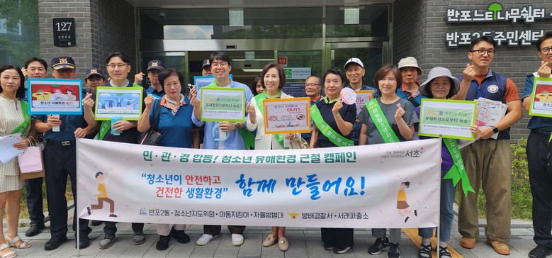이러한 문제를 해결하고자 마련된 이번 청소년 보호 캠페인에는 이숙자 위원장과 함께 서초구 반포2동, 방배경찰서, 서래 파출소, 청소년지도위원, 아동지킴이, 자율방범대 등 20 여명의 지역사회 인사들이 참석하였다.