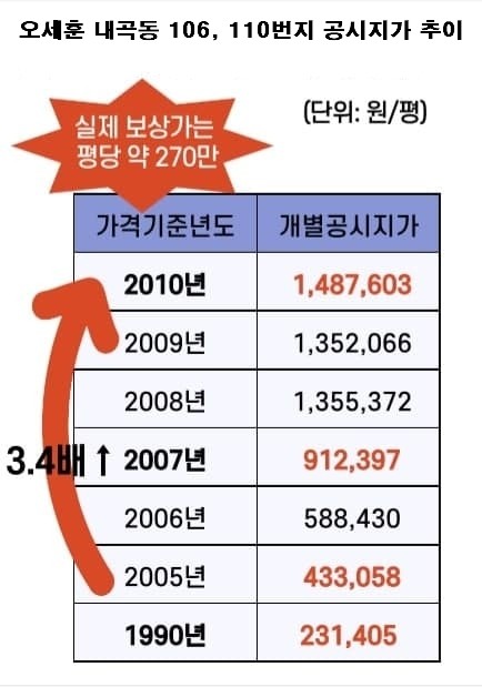 오세훈 후보의 내곡동 106번지와 110번지 땅의 공시지가는 1990년에 평당 23만원, 2005년에 43만원이었습니다. 15년 동안 겨우 20만원 올랐습니다. 그런데 보금자리주택지구로 지정되면서 2010년 148만원으로 껑충 뛰어올랐습니다. 5년 만에 3배가 넘게 오른 것입니다.