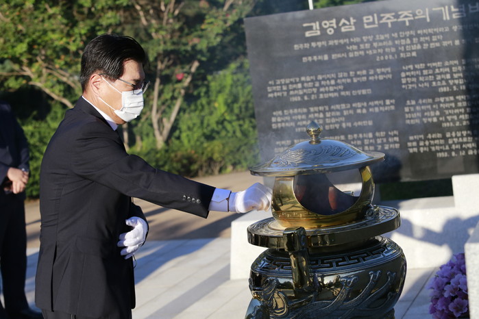 홍 대표는 이어 김영삼 대통령 묘소도 찾아 "김 대통령님께서는 대단한 돌파력을 가지셨던 분이셨다면서, 금융실명제를 실시하고 3당 통합을 이끌어 내셨던 분이다"고 말했다.