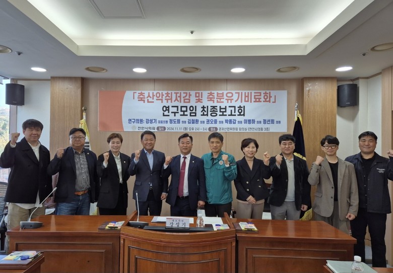 [천안시 세계타임즈=백택기 기자] 천안시의회(의장 김행금)는 11일 경제산업위원회 회의실에서 '축산악취저감 및 축분 유기 비료화' 연구모임(대표의원 강성기) 최종보고회를 개최하고, 그간의 연구 활동과 정책 연구용역 결과를 발표했다.