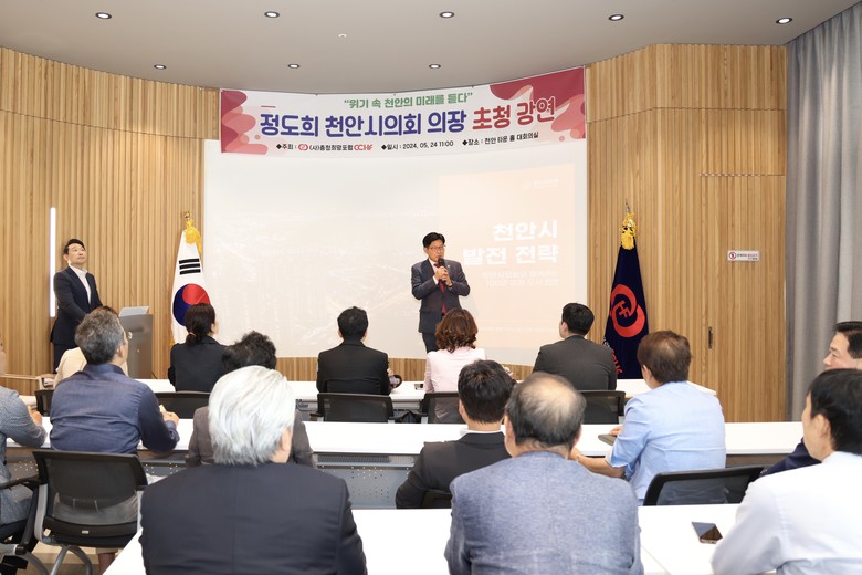 [천안시 세계타임즈=백택기 기자] 정도희 천안시의회 의장은 24일 천안타운홀에서 열린 사단법인 충청희망포럼에서 주최한 월례회에서 천안시의회 의장자격으로 “천안시 미래발전 전략”에 대하여 특강을 하였다.