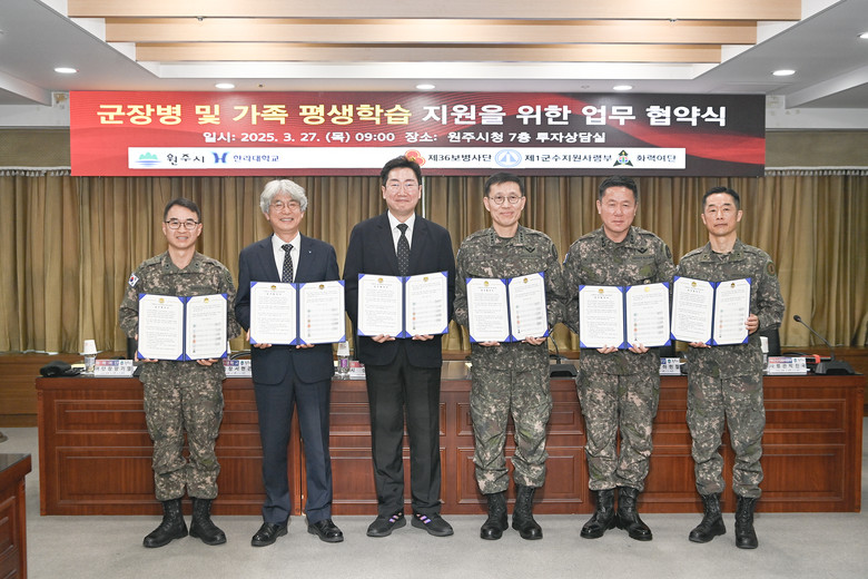 [원주시 세계타임즈=김민석 기자] 원주시는 지난 27일 원주시 주둔 4개 군부대 및 한라대학교와 ‘군장병 및 가족 평생학습 지원’을 위한 업무협약(MOU)을 체결했다.