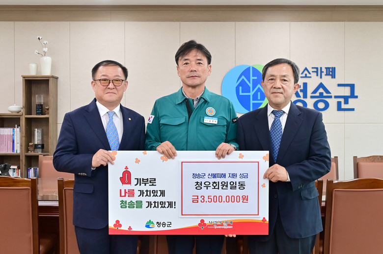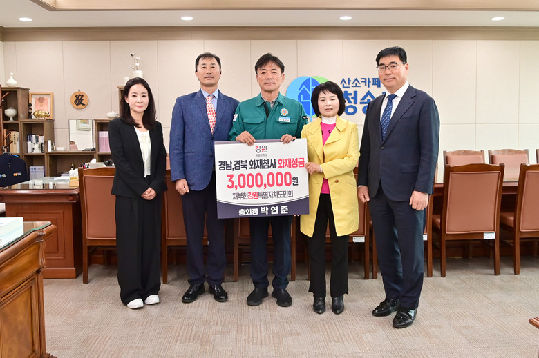 윤경희 청송군수는 “힘든 시기에도 보여주신 따뜻한 연대와 나눔이 큰 위로와 힘이 된다.”며, “소중한 성금은 피해 주민들의 일상 회복과 지역사회의 재건을 위해 소중히 사용하겠다.”라고 밝혔다.