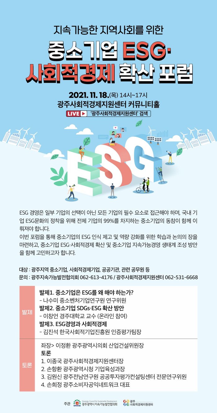 [광주=세계타임즈 손권일 기자] 광주광역시, 광주광역시의회, 광주광역시지속가능발전협의회, 광주사회적경제지원센터의 공동 주최 및 주관으로 우리 경제의 중추 역할을 하는 중소기업의 ESG경영 시스템 안착 방안을 모색하기 위한 ‘지속가능한 지역사회를 위한 중소기업 ESG·사회적경제 확산 포럼’을 개최한다.