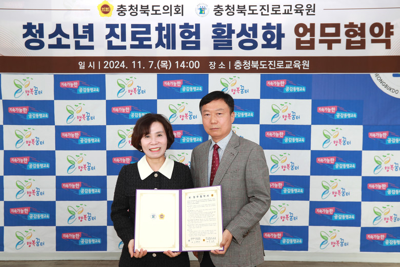 [충북 세계타임즈=이현진 기자] 충북도의회(의장 이양섭)와 충청북도진로교육원(원장 오병미)은 7일 충청북도진로교육원에서 ‘청소년 진로체험 활성화 업무협약’을 체결했다.