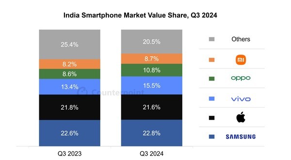 시장조사업체 카운터포인트 리서치가 최근 발표한 '2024년 3분기 인도 스마트폰 시장 매출 점유율'에 따르면 삼성전자가 22.8%로 1위를 기록했다.