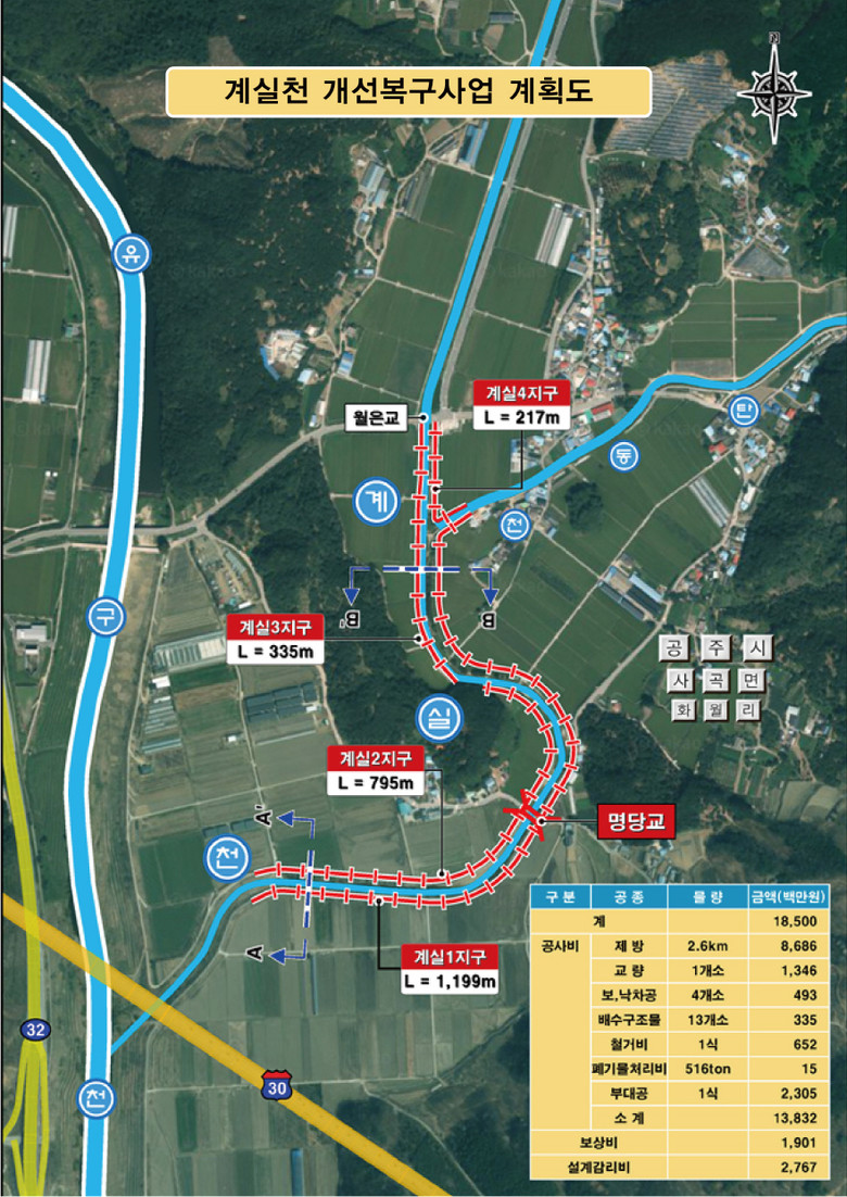 사업의 주요 내용은 제방 및 호안 정비 2.6km, 교량 재가설 1개소, 보 및 낙차공 정비 4개소, 배수시설물 정비 13개소 등이다.
