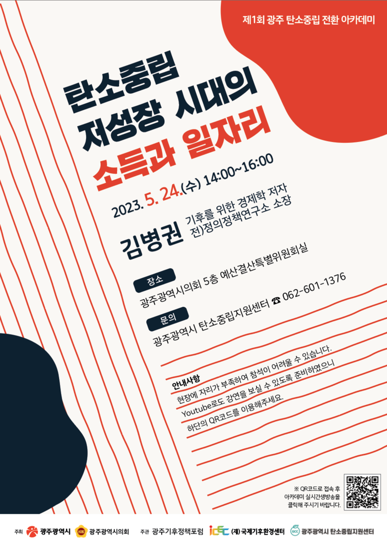 이날 제1회 아카데미에서는 ‘기후를 위한 경제학’의 저자이자 전 정의정책연구소장인 김병권 작가가 ‘탄소중립 저성장 시대의 소득과 일자리’를 주제로 강연에 나선다.