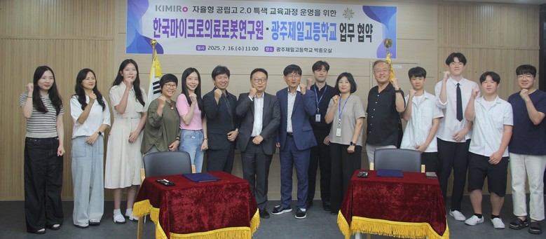 [광주 세계타임즈=손권일 기자] 광주제일고등학교(이하 광주제일고)와 한국마이크로의료로봇연구원(KIMIRo)은 지난 16일 박종오실(AI팩토리실)에서 광주제일고 교장 이규연, 한국마이크로의료로봇연구원 박종오 원장 등이 참석한 가운데 ‘자율형 공립고 2.0’ 사업 지원을 위한 업무협약(MOU)을 체결했다.