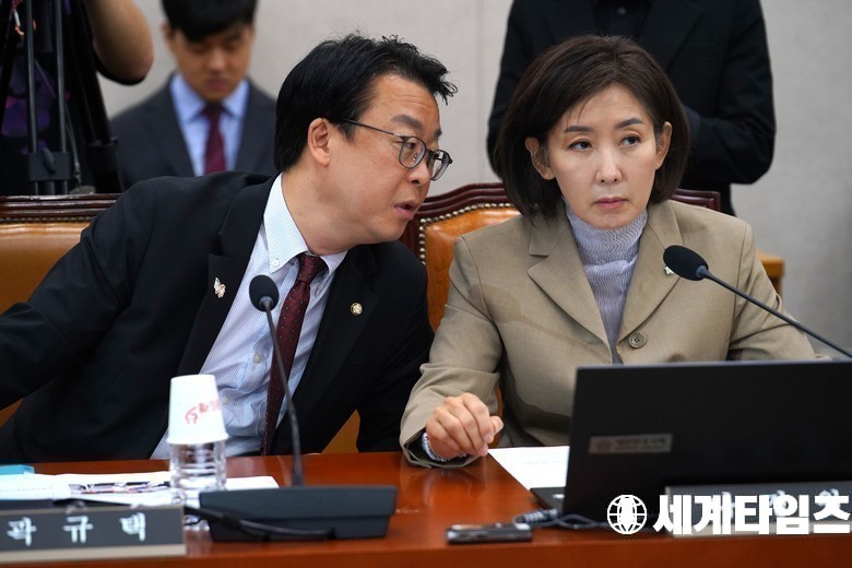 '곽규택''나경원' 국민의힘 의원이 16일 오전 서울 여의도 국회에서 열린 법제사법위원회 전체회의에서 대화를 나누고 있다.