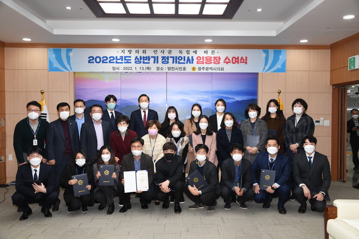 [광주=세계타임즈 손권일 기자] 광주광역시의회(의장 김용집)는 1월 13일 2022년도 상반기 정기인사에 따른 임용장 수여식을 가졌다.