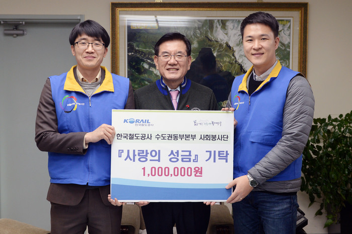 [세계타임즈 이채봉 기자]동대문구(구청장 유덕열)는 22일 오후 3시 30분 한국철도공사 수도권동부본부 봉사단이 동대문구청을 방문해 구청장실에서 관내 노숙인을 위해 써달라며 성금 백만원을 기탁했다고 밝혔다.