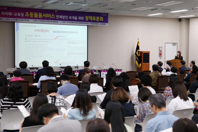 [부산 세계타임즈=이용우 기자] 올해부터 부산지역 304개 전체 초등학교에 늘봄학교가 전면 도입된 가운데, 부산시의회는 5.27.(월) 학교돌봄과 마을돌봄의 연계방안 모색을 위한 토론회를 개최했다. 이번 토론회는 지역아동센터, 다함께돌봄센터 등 ‘마을돌봄’ 관계자와 초등학교 돌봄전담사 등 ‘학교돌봄’ 관계자가 함께 지자체와 교육청 산하의 분절된 돌봄서비스 연계 방안을 논의하기 위한 자리로 마련되었다.