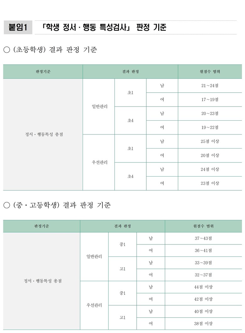 이종환 의원이 부산시교육청으로부터 제출받은 서면질문 답변서에 따르면, 부산시교육청은 초1·4, 중1, 고1 학생들을 대상으로 학생 정서·행동 특성검사(학생 정신건강 실태조사)를 실시하고 있다. 아래와 같이, 부산시 초등학생(초1·4)에서 관심군 비율이 3년 연속 증가(2022년 2.4%, 2023년 2.6%, 2024년 3.2%)하고 있음은 물론, 총 관심군 비율도 0.1%P 증가하였음을 확인할 수 있다. 관심군이란 정서·행동 특성 총점으로 일반관리 및 우선관리 판정을 받은 학생 군을 뜻하며 그 총점 기준은 <붙임1>과 같다는 것이 부산시교육청의 답변이다.