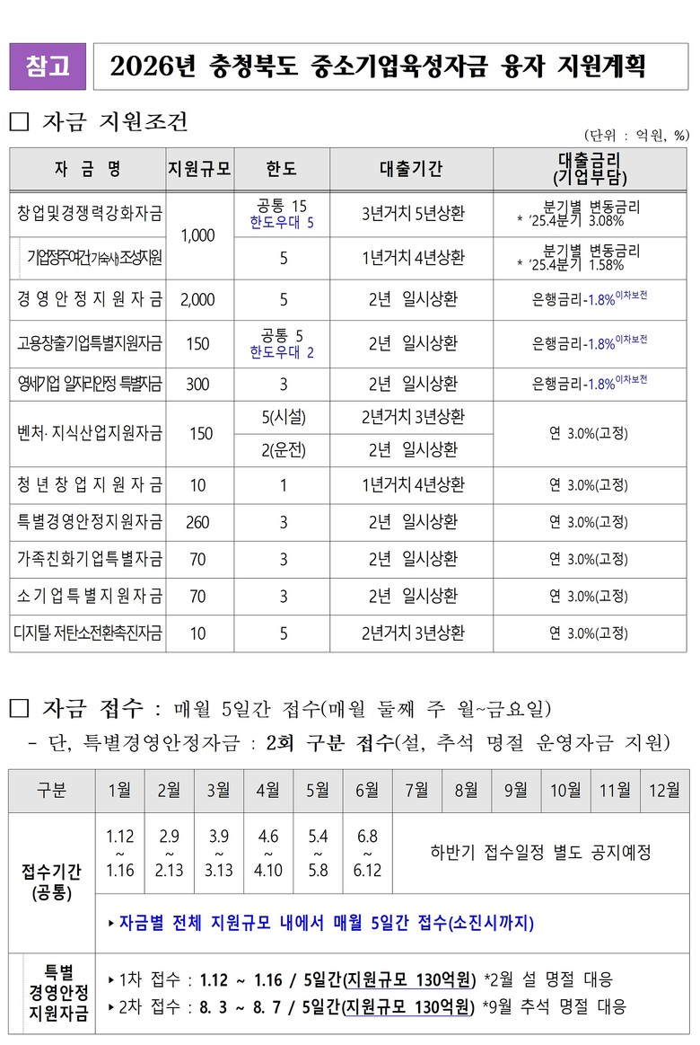 충북도 강태인 경제기업과장은 “2026년은 고물가·고환율 등 경영 어려움이 지속되면서도, 회복과 성장의 전환기로서 중요한 시기인 만큼, 현장 의견을 적극 수렴하여 다각적인 자금 지원 시책을 마련했다”면서 “앞으로도 국내외 경제 상황에 맞춰 중소기업 자금이 적기에 지원되도록 최선을 다하겠다”고 밝혔다.