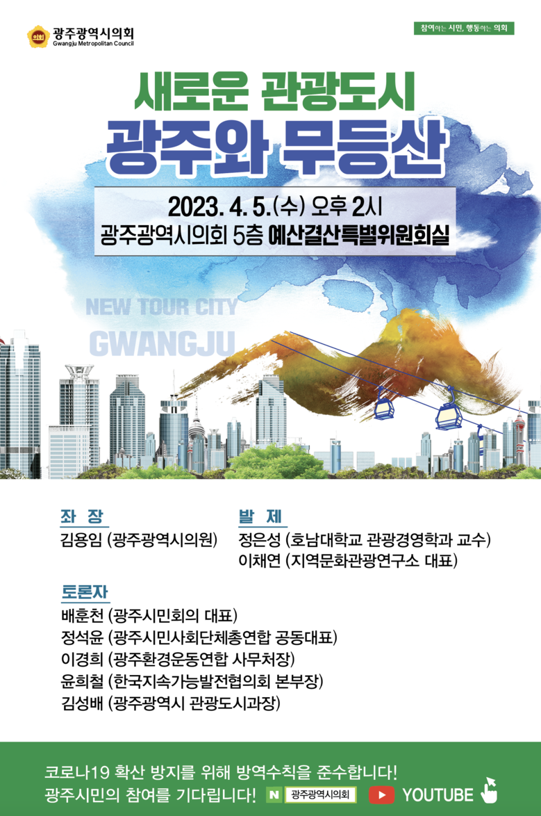 '새로운 관광도시 광주와 무등산‘을 주제로 한 토론회는 4월 5일 오후 2시, 광주시의회 5층에서 개최된다.